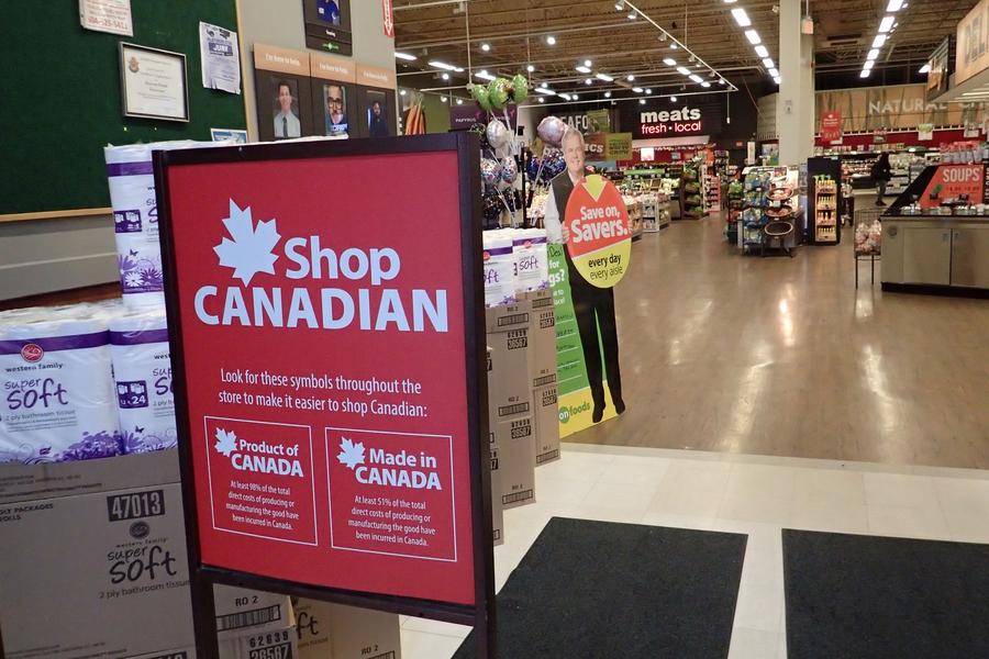A "Shop Canadian" sign is seen at the entrance of a supermarket in Vancouver, British Columbia, Canada, March 4, 2025. (Photo by Liang Sen/Xinhua)