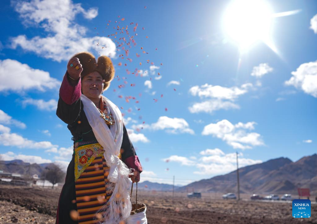 Farmers participate in a ceremony marking the start of spring farming in Quxar Town of Lnaze County, southwest China's Xizang Autonomous Region, March 16, 2025. Ceremonies marking the start of spring farming were held across Xizang on Sunday. The ceremony holds great significance as it marks the beginning of a new year's farming season and serves as a prayer for favorable weather and bountiful harvests. It is considered an important ritual in the farming regions of Xizang. (Xinhua/Jiang Fan)