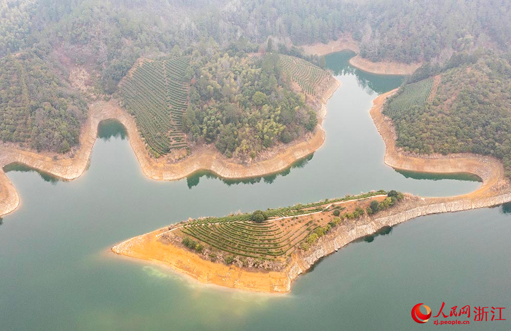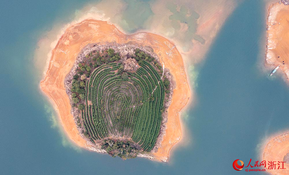 Aerial photo shows an ecological tea garden located on an island in Qiandao Lake, Chun'an county, Hangzhou city of east China's Zhejiang Province. (People's Daily Online/Zhang Yongtao)