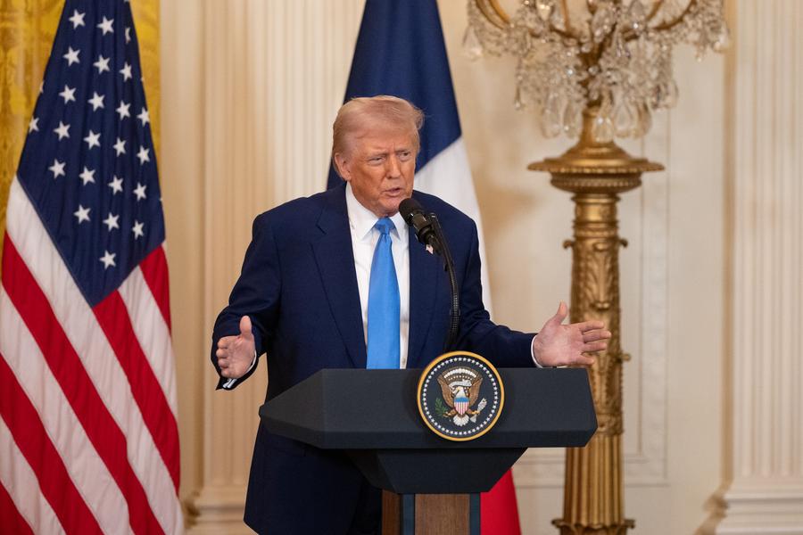 U.S. President Donald Trump speaks at a joint press conference with French President Emmanuel Macron (not in the picture) at the White House in Washington, D.C., the United States, on Feb. 24, 2025. (Xinhua/Hu Yousong)