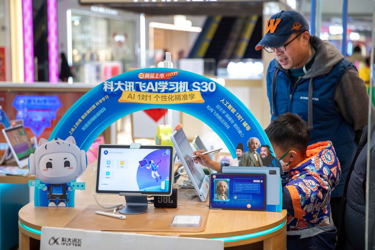 People check out a newly released AI studying pad from tech company iFlytek in a shopping center in Shanghai on Jan 17. (Photo/China Daily)