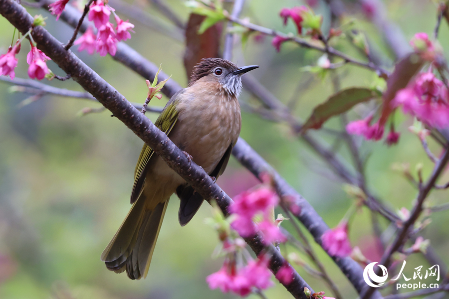 A mountain bulbul perches on the branch of a blooming cherry tree in Xiamen, southeast China's Fujian Province. (People's Daily Online/Chen Bo)