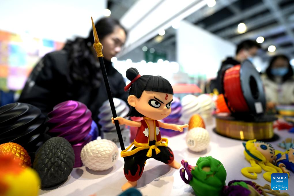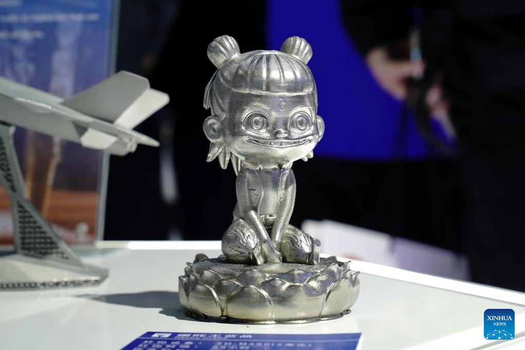 A 3D-printed Nezha figurine is displayed at TCT Asia 2025 at the National Exhibition and Convention Center (Shanghai) in Shanghai, east China, March 17, 2025. TCT Asia 2025, a three-day event featuring industrial 3D printing and additive manufacturing, kicked off here on Monday. (Xinhua/Zhang Jiansong)
