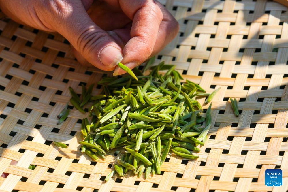 A farmer selects tea leaves at a tea garden of an agricultural demonstration park in Wuzhong District, Suzhou City, east China's Jiangsu Province, March 17, 2025. Harvest season for Biluochun, one of the top tea varieties in China and the speciality of Suzhou, has recently arrived. Farmers in Wuzhong District of Suzhou are busy harvesting tea leaves ahead of the Qingming Festival to produce the Mingqian (literally "pre-Qingming") tea, which are made of the very first tea sprouts in spring and considered to be of high quality. (Xinhua/Li Bo)