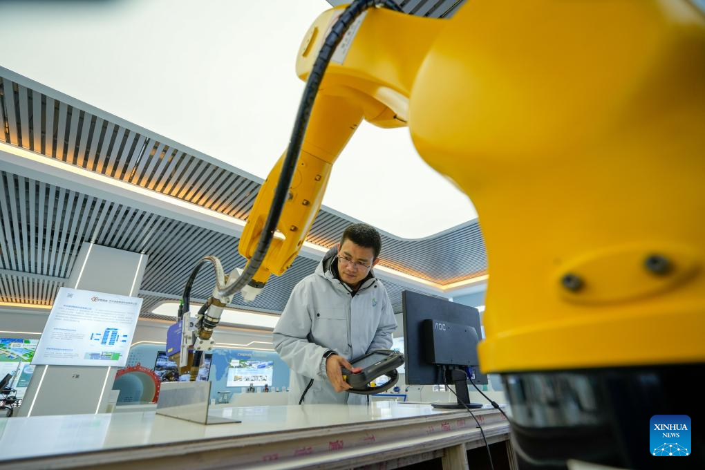 A staff member displays a welding robot product at a robot display and experience center in Tangshan, north China's Hebei Province, Feb. 18, 2025. (Xinhua/Mu Yu)