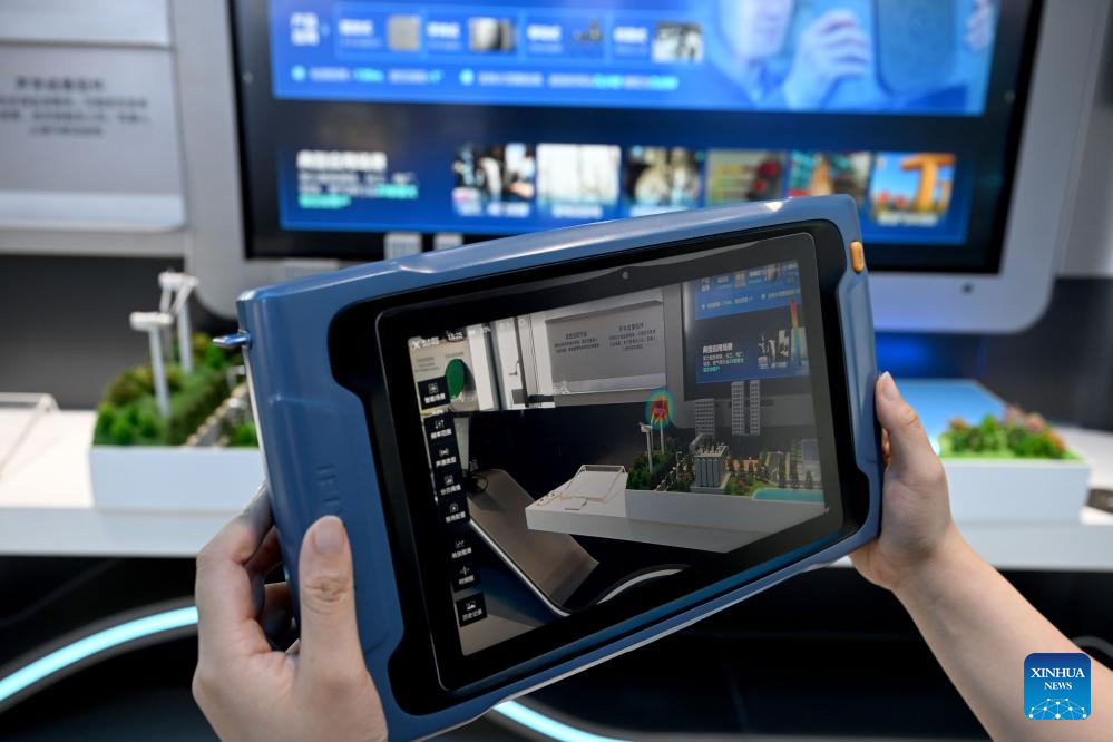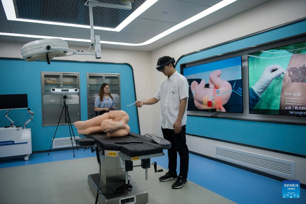 A staff member of Reacool Medical Technology Co., Ltd. demonstrates a digital surgery aided platform at a simulated operating room in the Vision Valley of China in Wuhu City, east China's Anhui Province, Sept. 20, 2024. (Photo by Xiao Benxiang/Xinhua)