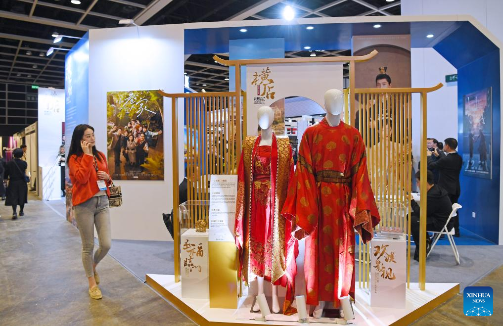 Film and television clothing is displayed at the booth of Hengdian cinematic and cultural industry cluster zone at the Hong Kong International Film and TV Market (FILMART), in Hong Kong, south China, March 17, 2025. The 29th Hong Kong FILMART opened on Monday, kicking off a four-day bonanza attended by over 760 exhibitors from 34 countries and regions. (Xinhua/Chen Duo)