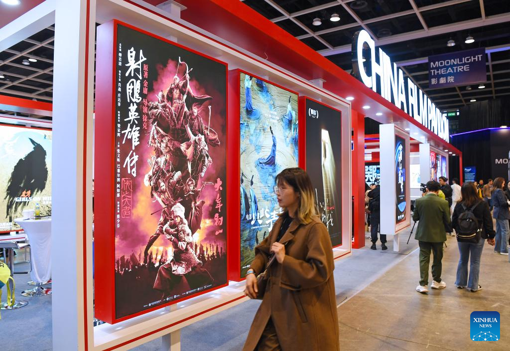People view the joint exhibition booth of Chinese films at the Hong Kong International Film and TV Market (FILMART) in Hong Kong, south China, March 17, 2025. The 29th Hong Kong FILMART opened on Monday, kicking off a four-day bonanza attended by over 760 exhibitors from 34 countries and regions. (Xinhua/Chen Duo)