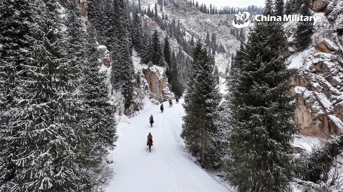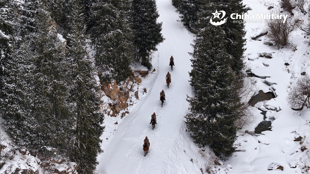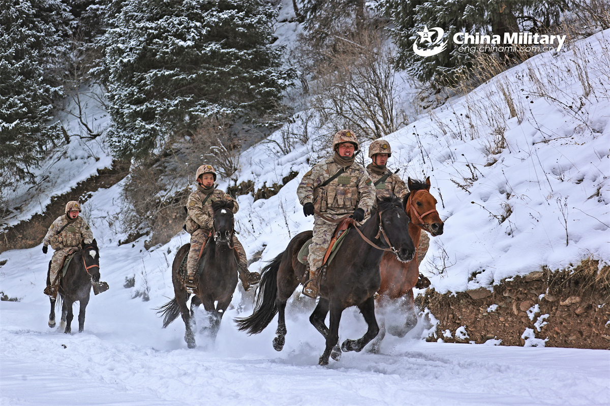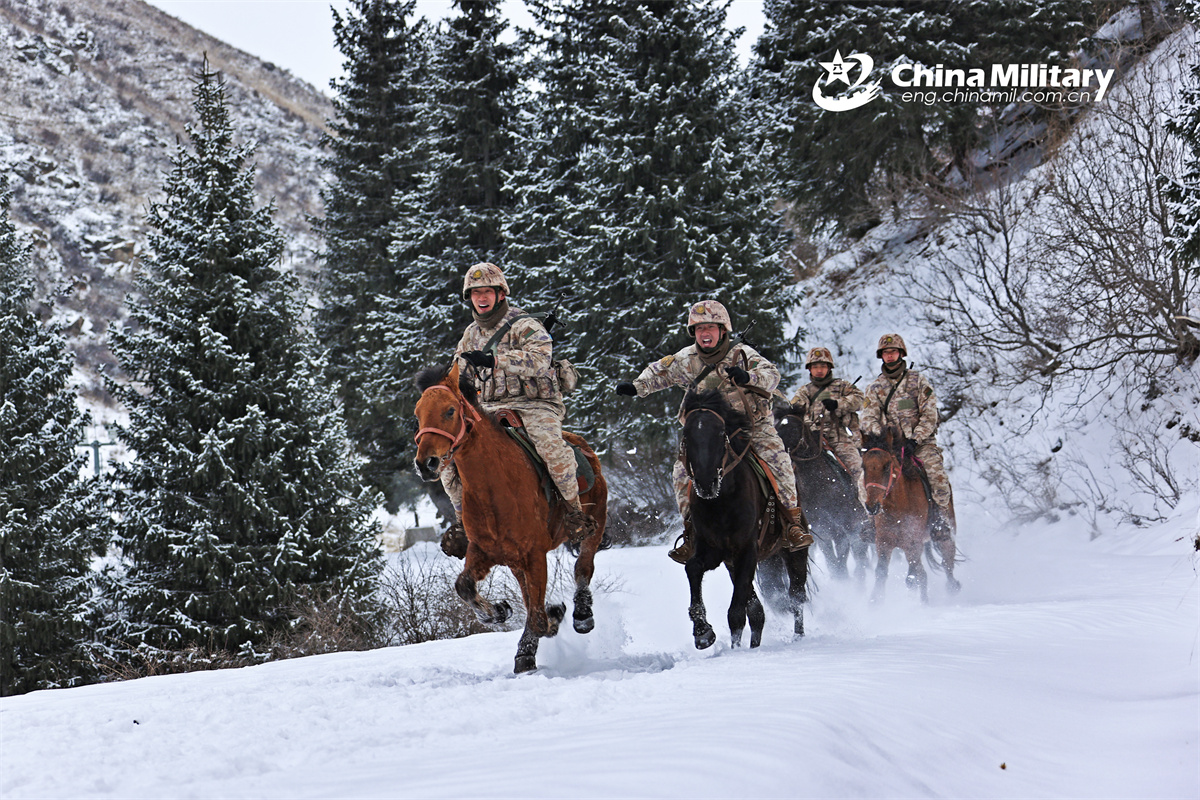 Soldiers assigned to a border defense company under the Chinese PLA Army patrol the snow-covered border area on horseback in northwest China's Xinjiang Uygur Autonomous Region on March 3, 2025. (eng.chinamil.com.cn/Ma Wenqing)