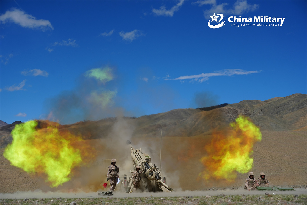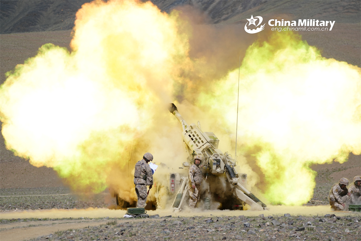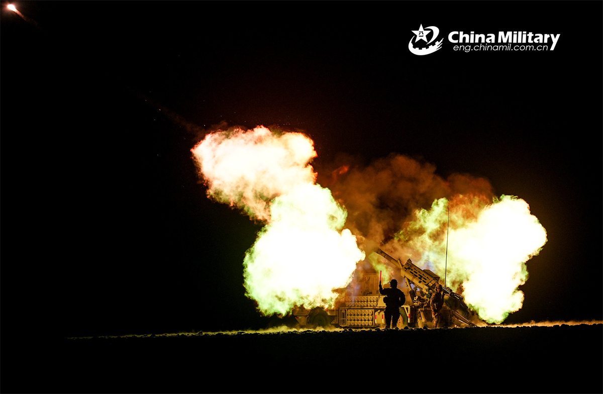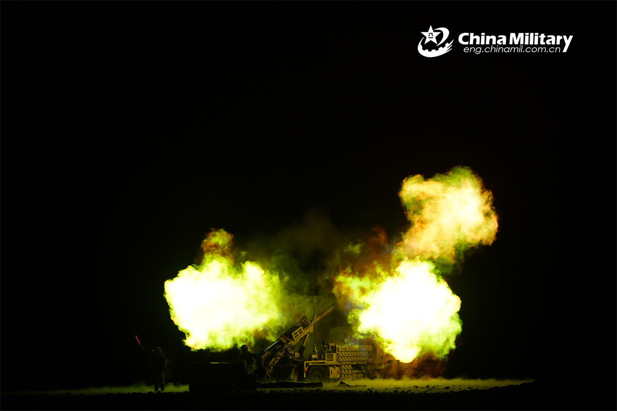 A vehicle-mounted howitzer attached to an army regiment under the Chinese PLA Xinjiang Military Command spits fire at mock targets during a nighttime training exercise in early March 2025. (eng.chinamil.com.cn/Chen Lihui)
