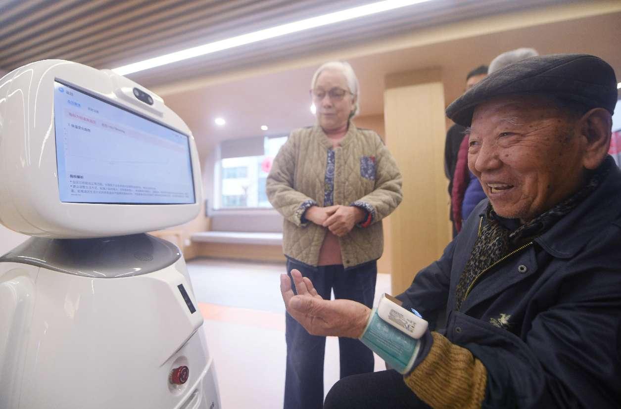 An AI-assisted elderly care robot tests blood pressure for a senior resident in a social service center in Hangzhou, east China's Zhejiang province. (People's Daily Online/Long Wei)