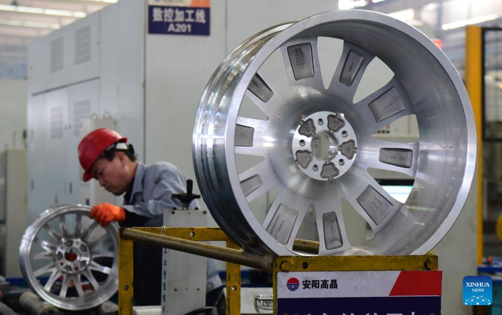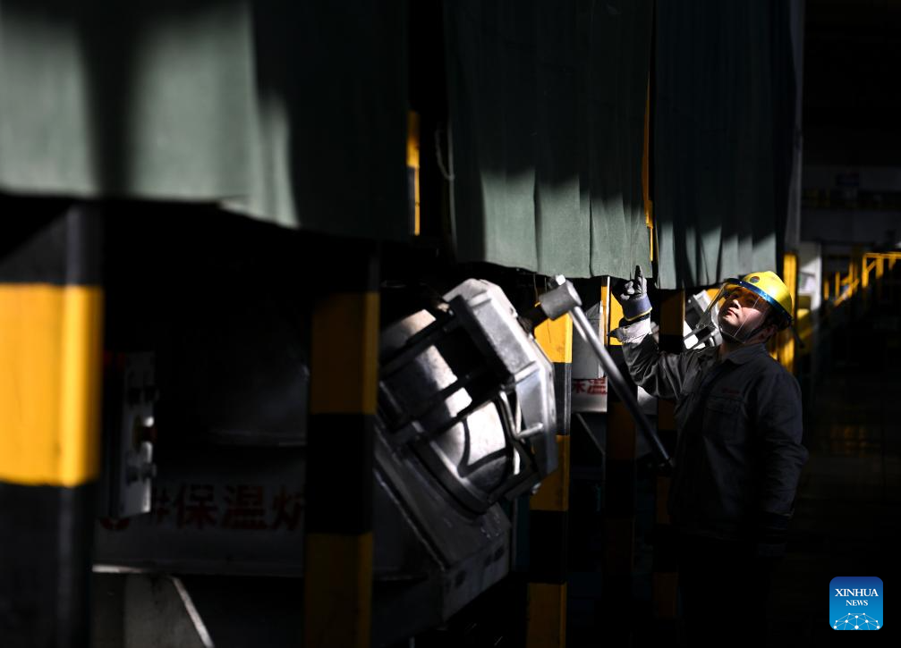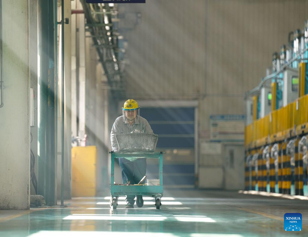 A staff member works at a workshop of an aluminum material company in the Hongqi Canal Economic and Technological Development Zone of Linzhou City, central China's Henan Province, March 19, 2025. (Xinhua/Zhu Xiang)