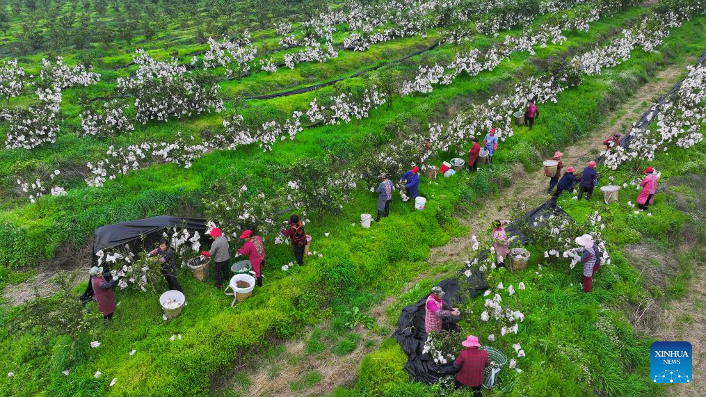 An aerial drone photo taken on March 18, 2025 shows farmers picking oranges at a fruit garden in Jinya Town of Langzhong City, southwest China's Sichuan Province. With the approaching of spring equinox, or Chunfen in Chinese, the fourth solar term in the Chinese lunar calendar which will fall on March 20 this year, farmers across the country are busy working at fields. (Photo by Wang Yugui/Xinhua)