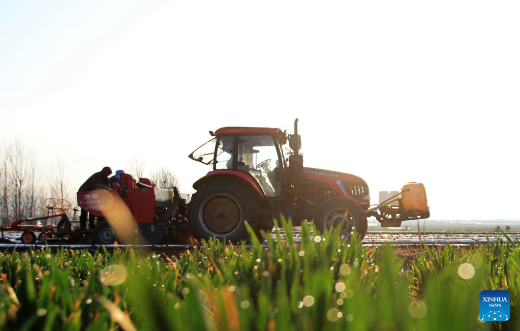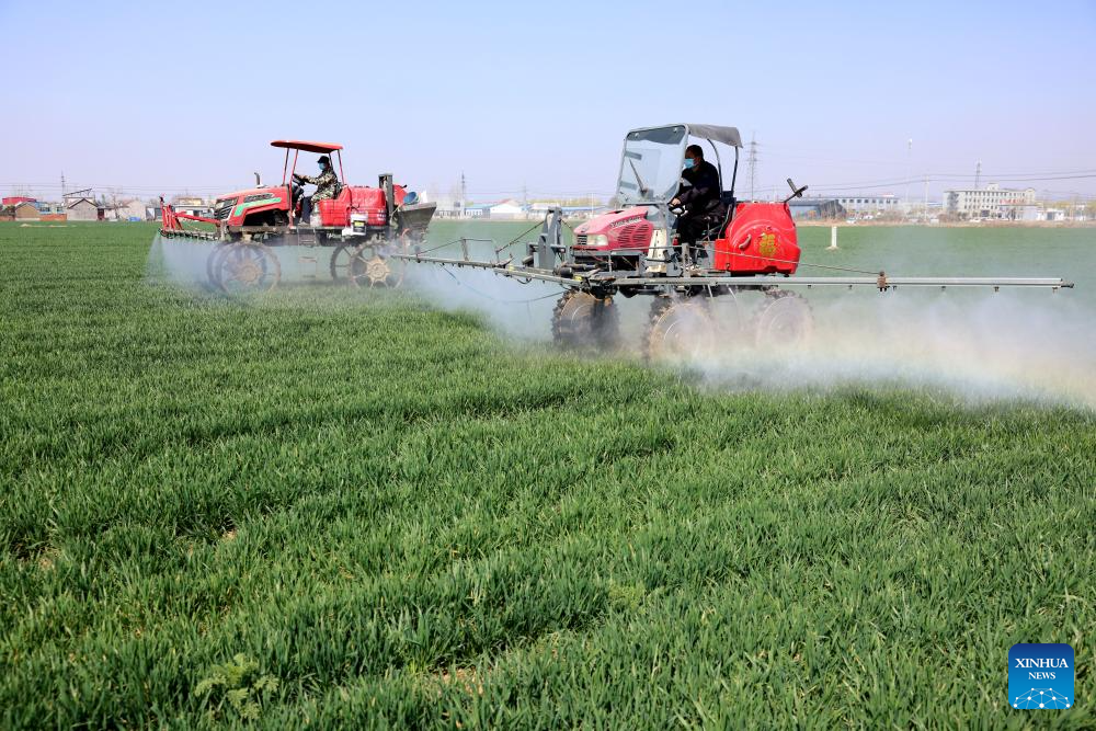 Farmers drive machines to fertilize wheat field in Santun Village, Zaozhuang City of east China's Shandong Province, March 19, 2025. With the approaching of spring equinox, or Chunfen in Chinese, the fourth solar term in the Chinese lunar calendar which will fall on March 20 this year, farmers across the country are busy working at fields. (Photo by Sun Zhongzhe/Xinhua)