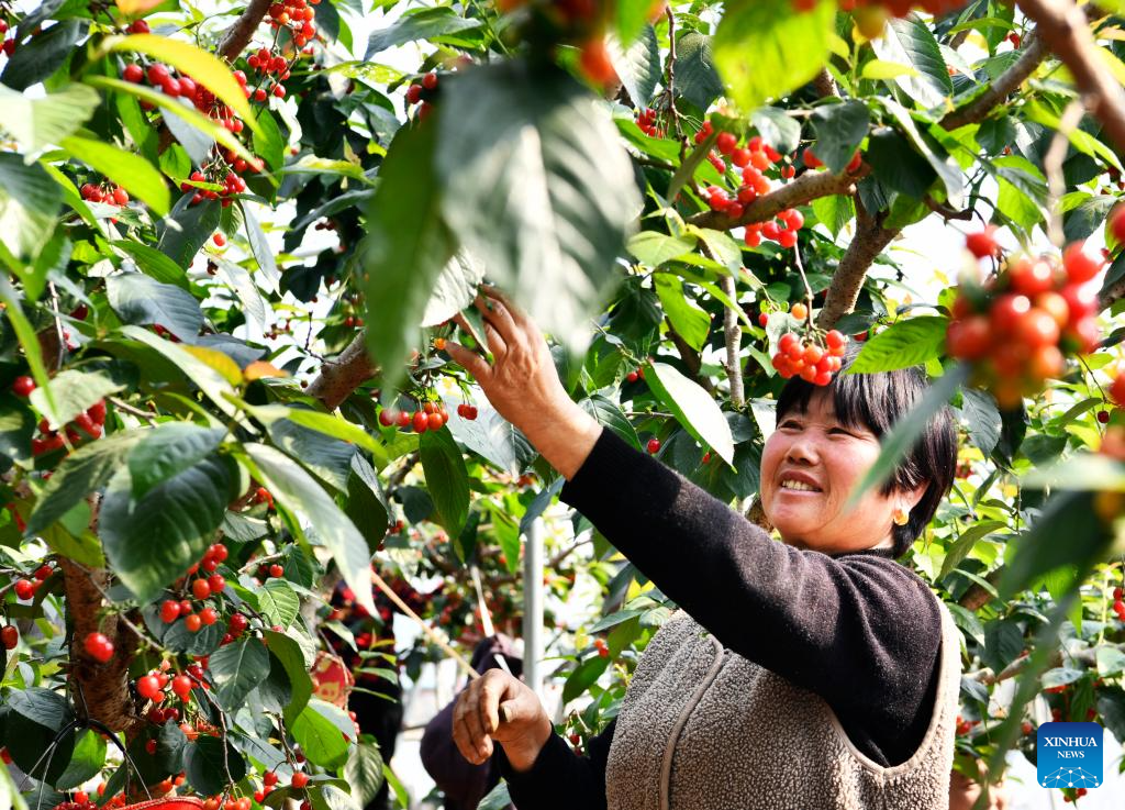 A farmer picks cherries at a greenhouse in Yuzishan Village, Zaozhuang City of east China's Shandong Province, March 19, 2025. With the approaching of spring equinox, or Chunfen in Chinese, the fourth solar term in the Chinese lunar calendar which will fall on March 20 this year, farmers across the country are busy working at fields. (Photo by Li Zongxian/Xinhua)