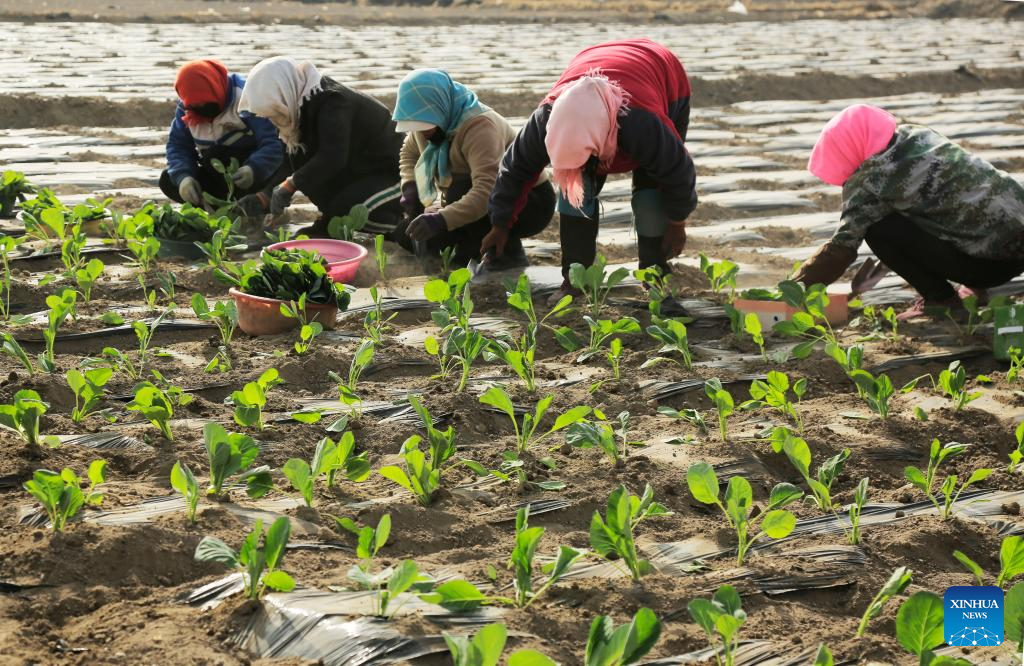 Farmers transplant vegetable seedlings at a field in Heman Village, Zhangye City of northwest China's Gansu Province, March 19, 2025. With the approaching of spring equinox, or Chunfen in Chinese, the fourth solar term in the Chinese lunar calendar which will fall on March 20 this year, farmers across the country are busy working at fields. (Photo by Chen Li/Xinhua)