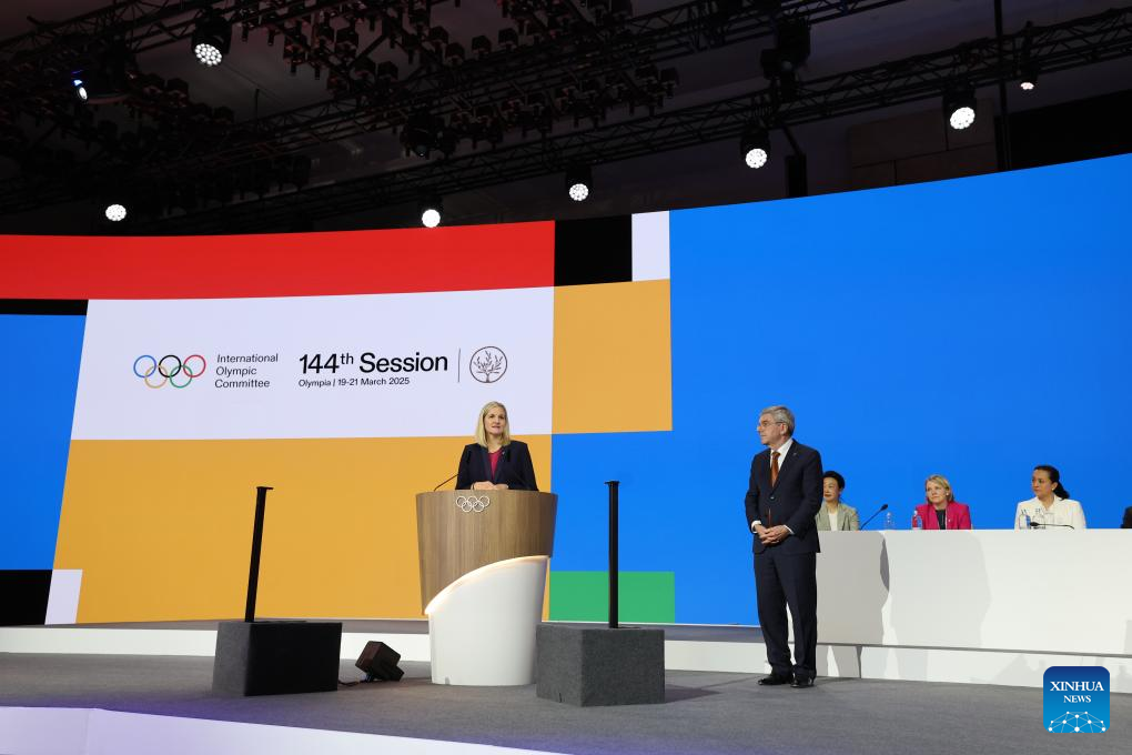 Kirsty Coventry (1st L) delivers a speech after being elected as the 10th president of the International Olympic Committee (IOC) during the 144th IOC session in Costa Navarino, Greece on March 20, 2025. (Xinhua/Cao Can)