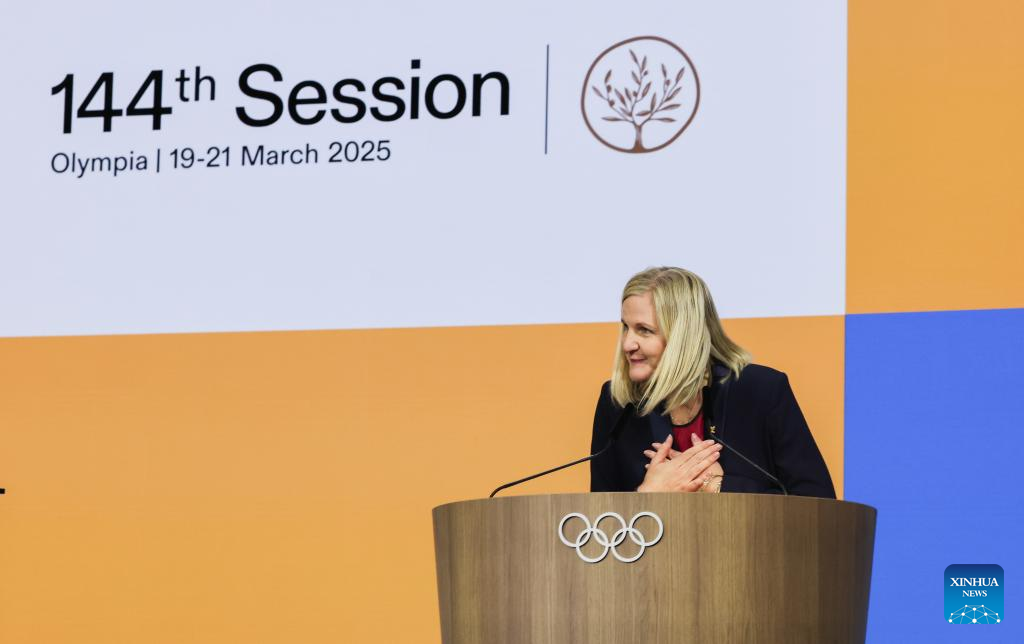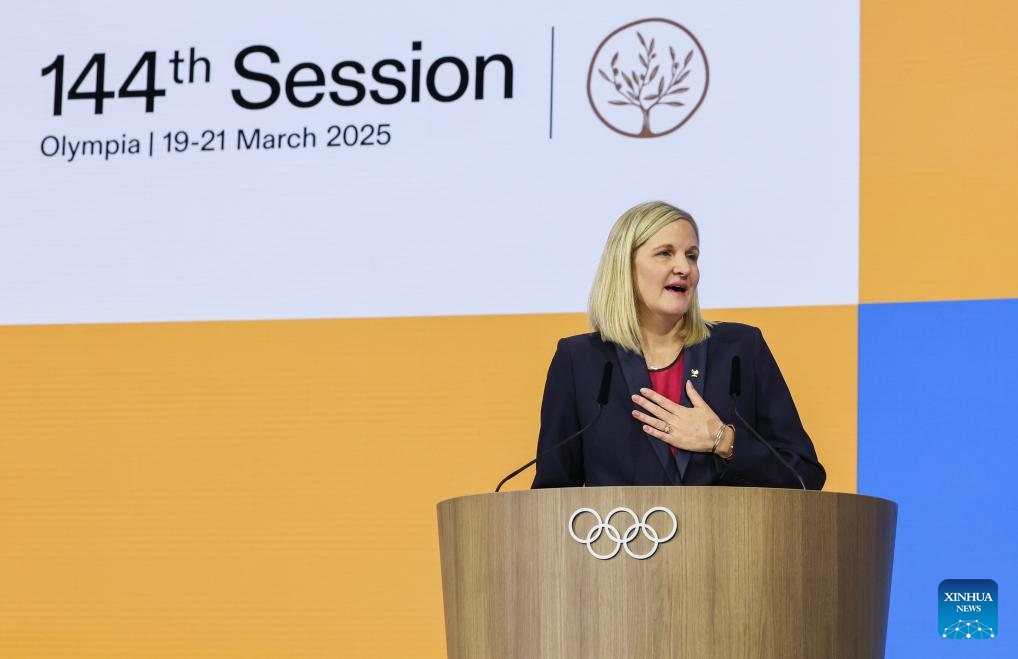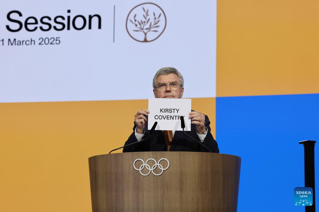 COSTA NAVARINO, March 20 (Xinhua) -- Kirsty Coventry was elected as the 10th president of the International Olympic Committee (IOC) on Thursday, making history as the first woman and the first African to lead the global Olympic movement.