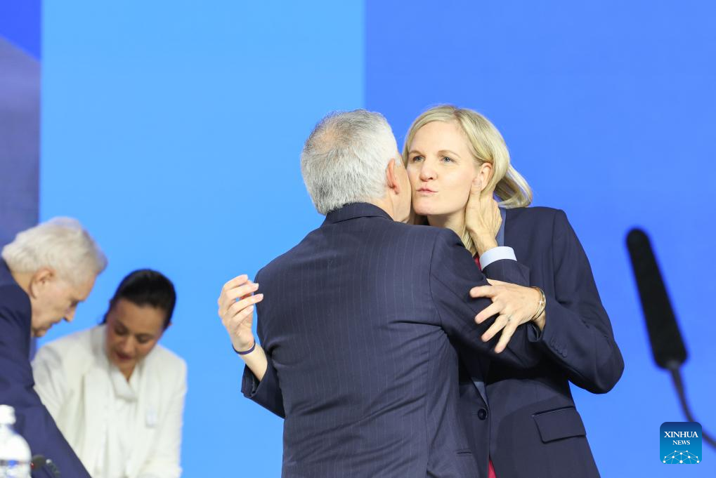 Vice president of the International Olympic Committee (IOC) Juan Antonio Samaranch Junior (2nd R) hugs Kirsty Coventry after she was elected as the 10th president of the IOC during the 144th IOC session in Costa Navarino, Greece on March 20, 2025. (Xinhua/Cao Can)