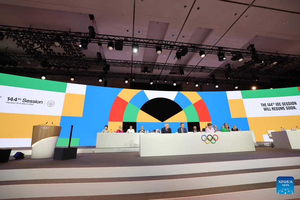 Photo taken on March 20, 2025 shows a general view of the 144th International Olympic Committee (IOC) session on the day of the election of the next President of the IOC, in Costa Navarino, Greece. Kirsty Coventry was elected as the 10th president of the IOC on Thursday. (Xinhua/Cao Can)
