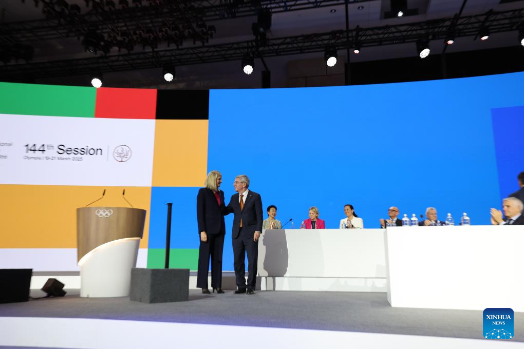 Thomas Bach (R) invites Kirsty Coventry to deliver a speech after she was elected as the 10th president of the International Olympic Committee (IOC) during the 144th IOC session in Costa Navarino, Greece on March 20, 2025. (Xinhua/Cao Can)