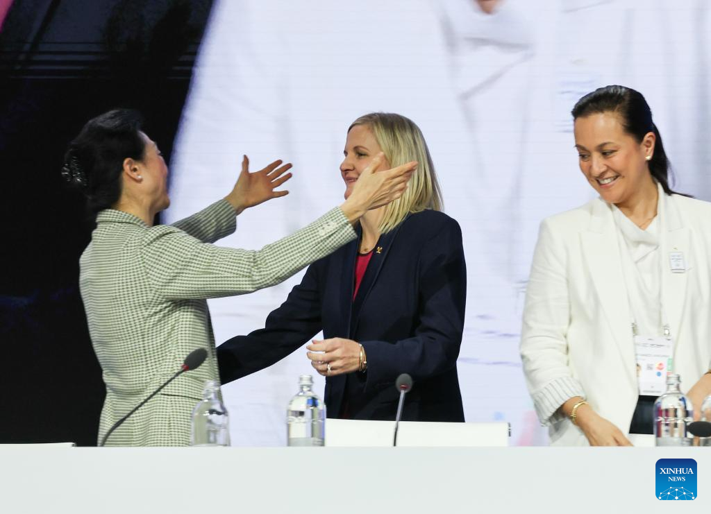 Li Lingwei (L) , member of the International Olympic Committee Executive Board, hugs Kirsty Coventry (C) after she was elected as the 10th president of the International Olympic Committee (IOC) during the 144th IOC session in Costa Navarino, Greece on March 20, 2025. (Xinhua/Cao Can)