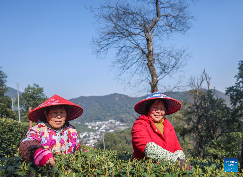 Tea farmers pick this year's first batch of West Lake Longjing tea in Wengjiashan Mountains, the first-class protected area of West Lake Longjing tea base, in Hangzhou, east China's Zhejiang Province, March 20, 2025. (Xinhua/Xu Yu)
