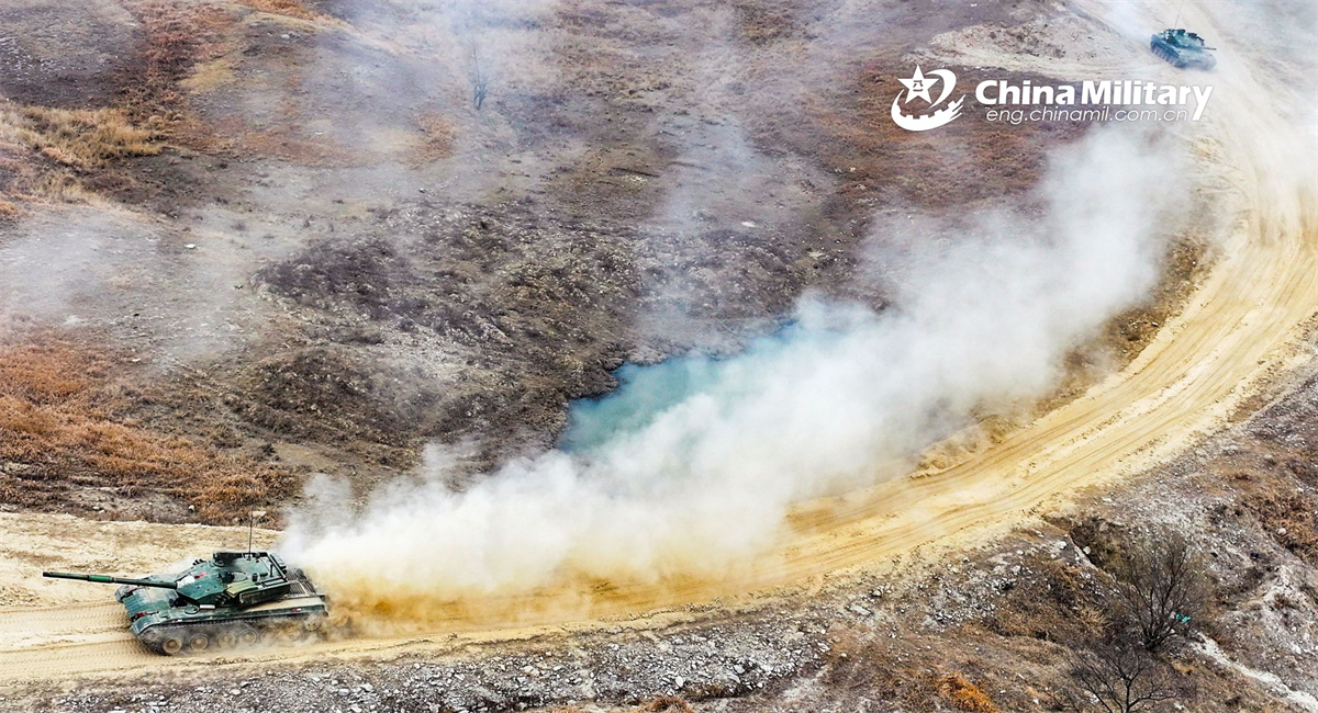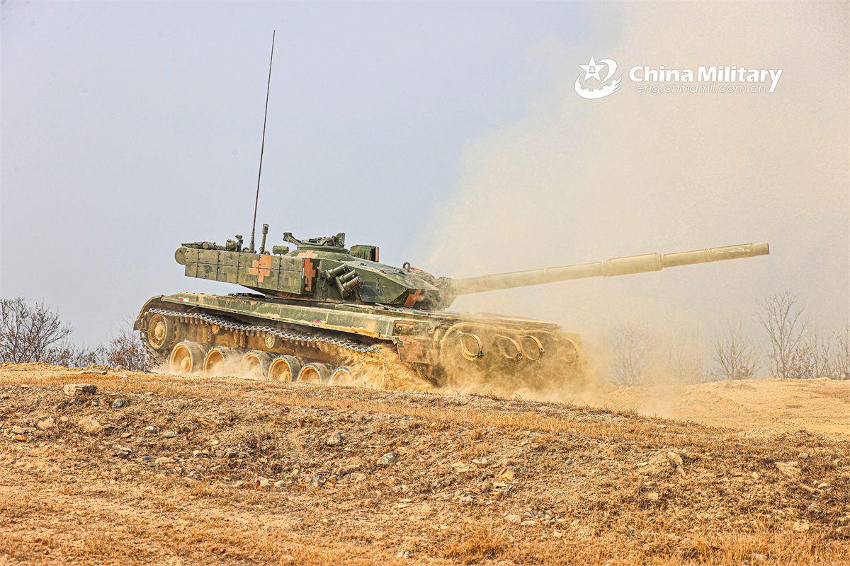 A main battle tank (MBT) attached to a combined-arms brigade of the Chinese PLA Army kicks up plumes of dust en route to the designated training field during a live-fire shooting training exercise in early March 2025. (eng.chinamil.com.cn/Huang Zhenyu)