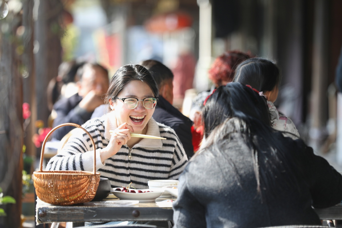 People enjoy a meal at a restaurant in a historical block in Nanhu district of Jiaxing city, East China's Zhejiang province. (Photo/Xinhua)