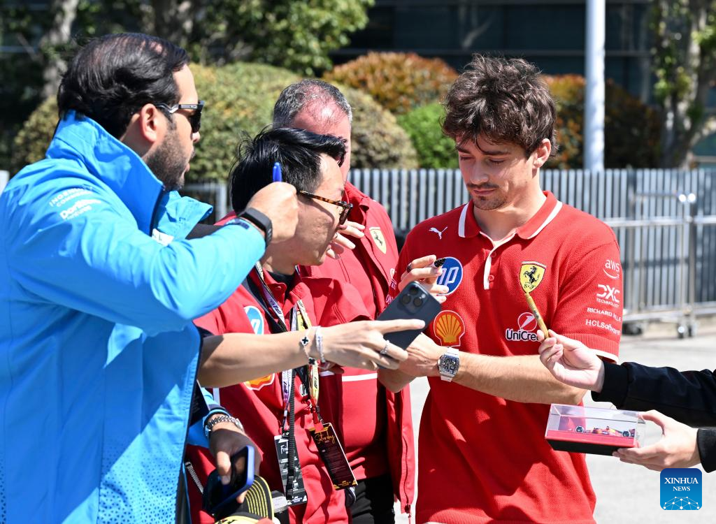Ferrari's driver Charles Leclerc (1sr R) of Monaco signs autographs for fans before the first practice session of the Formula 1 Chinese Grand Prix at the Shanghai International Circuit in east China's Shanghai, on March 21, 2025. (Xinhua/He Changshan)