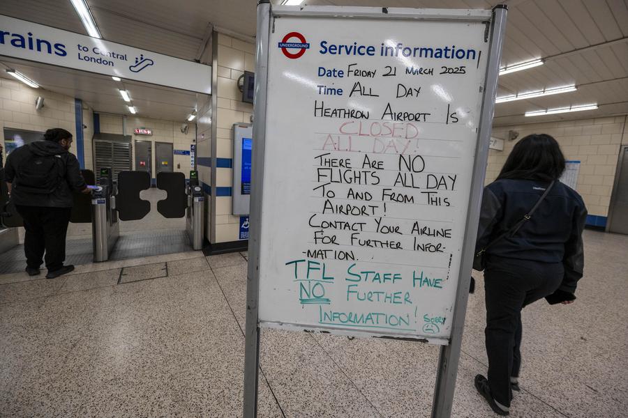 A notice board on the closure of Heathrow Airport is seen at Heathrow Airport in London, Britain, March 21, 2025. London's Heathrow Airport remains closed until midnight Friday due to a "significant power outage" caused by a fire at a nearby electricity substation, a spokesperson said. (Photo by Stephen Chung/Xinhua)
