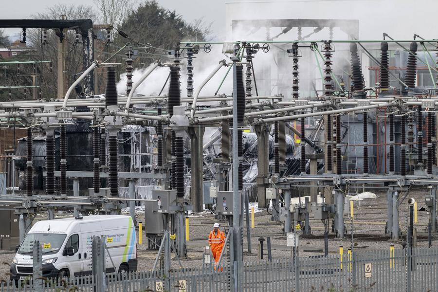 This photo taken on March 21, 2025 shows an electricity substation which suffered a fire near the Heathrow Airport in London, Britain. London's Heathrow Airport remains closed until midnight Friday due to a "significant power outage" caused by a fire at a nearby electricity substation, a spokesperson said. (Photo by Stephen Chung/Xinhua)