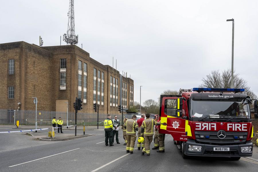 Firefighters work outside an electricity substation which suffered a fire near the Heathrow Airport in London, Britain, March 21, 2025. London's Heathrow Airport remains closed until midnight Friday due to a "significant power outage" caused by a fire at a nearby electricity substation, a spokesperson said. (Photo by Stephen Chung/Xinhua)