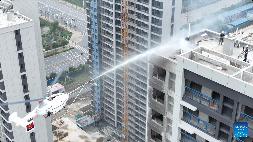 This file photo taken in October 2023 shows a TD550 coaxial unmanned helicopter taking part in a firefighting demonstration in Wuhu, east China's Anhui Province. (Photo/Xinhua)
