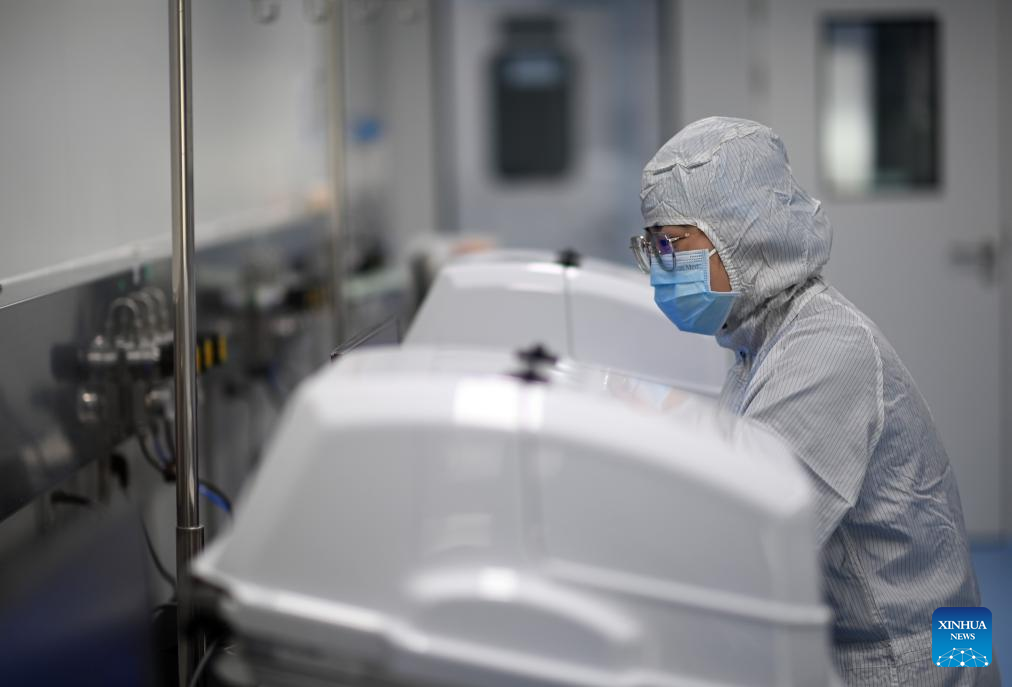 A staff member works at a cell culture room of a production base of Juventas Cell Therapy Ltd. in Tianjin, north China, March 21, 2025. In recent years, Binhai New Area in north China's Tianjin has optimized the business environment for private economy to accelerate its development. In 2024, the Economy Value Added of private economy in the area has increased by 9.1 percent year-on-year. (Xinhua/Zhao Zishuo)