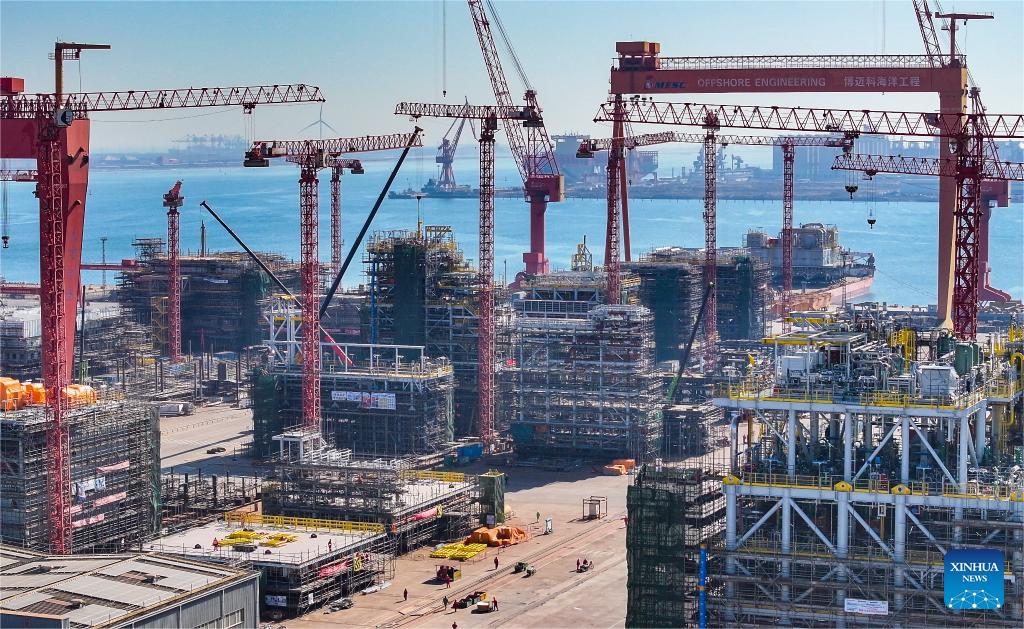An aerial drone photo taken on March 21, 2025 shows a view of the factory of the BOMESC Offshore Engineering Company Limited in Tianjin, north China. In recent years, Binhai New Area in north China's Tianjin has optimized the business environment for private economy to accelerate its development. In 2024, the Economy Value Added of private economy in the area has increased by 9.1 percent year-on-year. (Xinhua/Zhao Zishuo)