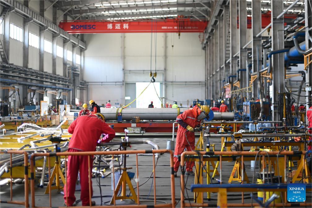 Staff members work at a stainless steel workshop of the BOMESC Offshore Engineering Company Limited in Tianjin, north China, March 21, 2025. In recent years, Binhai New Area in north China's Tianjin has optimized the business environment for private economy to accelerate its development. In 2024, the Economy Value Added of private economy in the area has increased by 9.1 percent year-on-year. (Xinhua/Zhao Zishuo)
