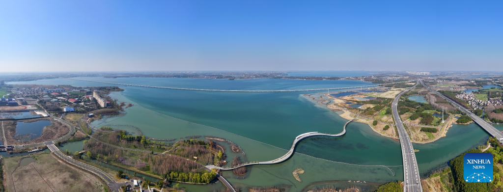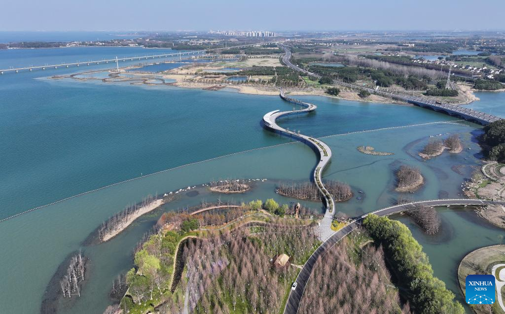 An aerial drone photo taken on March 17, 2025 shows a bridge on Yuandang Lake linking Wujiang District of Suzhou City in east China's Jiangsu Province and Qingpu District of east China's Shanghai. Through joint protection and governance, the lake has now become a tourist attraction.