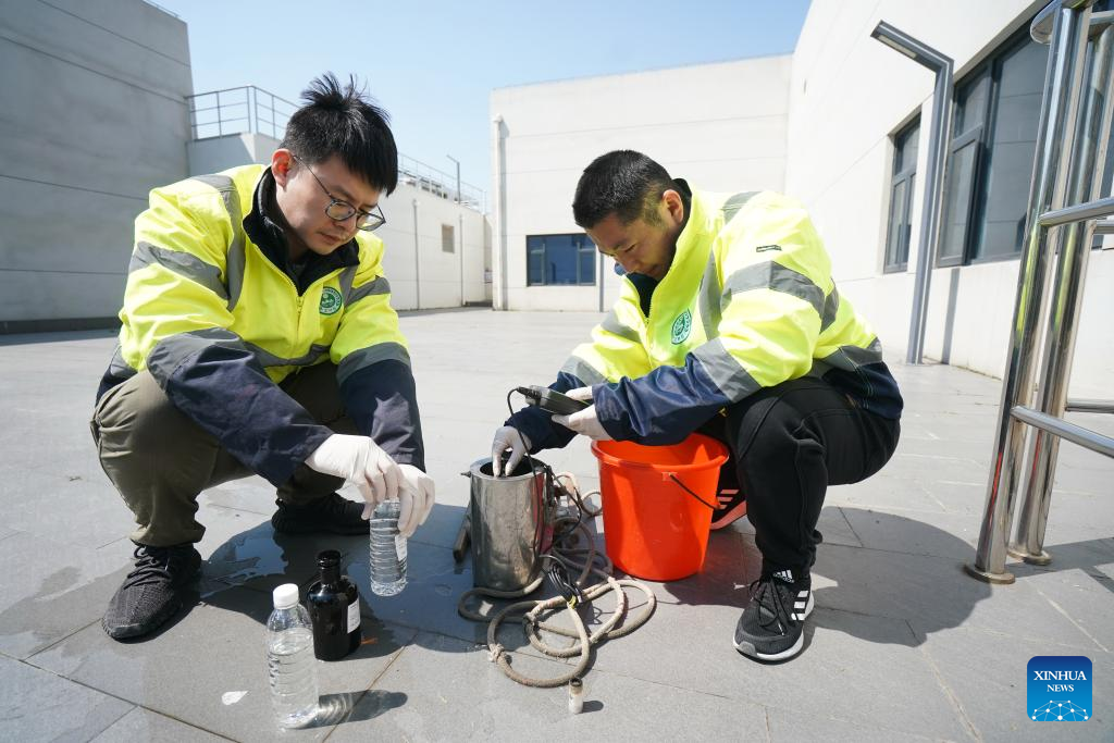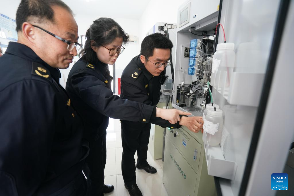 Law enforcement officers from ecological environment departments in Wujiang District of Suzhou City of Jiangsu Province, Qingpu District of Shanghai and Jiashan County of Zhejiang Province check monitoring equipment at an industrial waste water treatment plant in Wujiang District of Suzhou City in Jiangsu Province, March 18, 2025.
