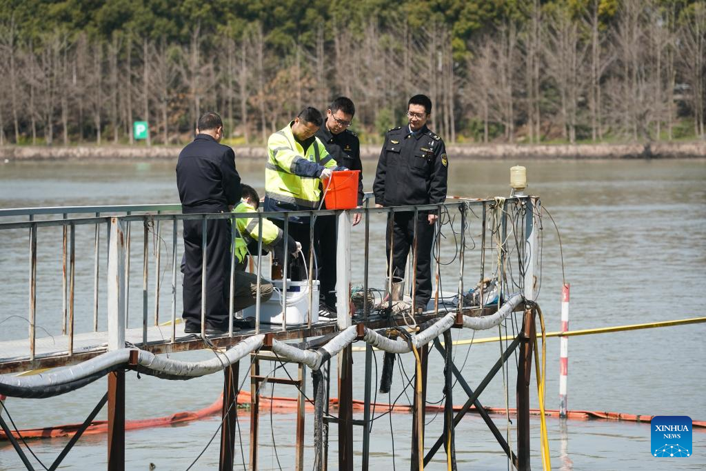 Staff members from ecological environment departments in Wujiang District of Suzhou City in Jiangsu Province, Qingpu District of Shanghai and Jiashan County of Zhejiang Province conduct joint water quality monitoring on the Taipu River in Wujiang District of Suzhou City, east China's Jiangsu Province, March 18, 2025.
