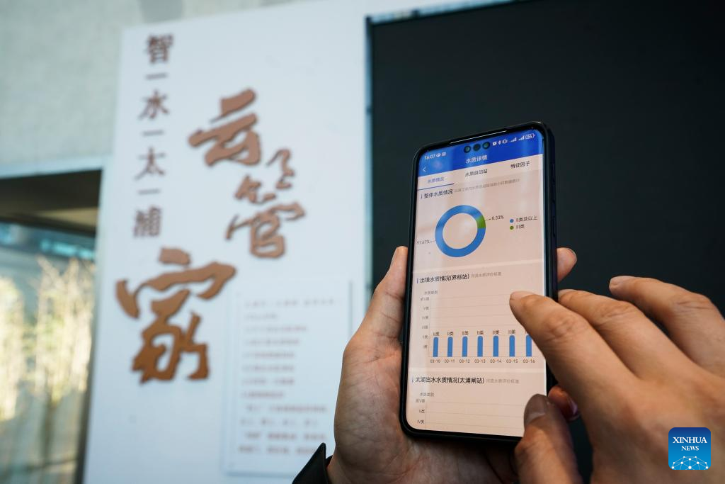 A staff member introduces an intelligent management platform developed to protect the environment of the Taipu River in Wujiang District of Suzhou City, east China's Jiangsu Province, March 17, 2025.