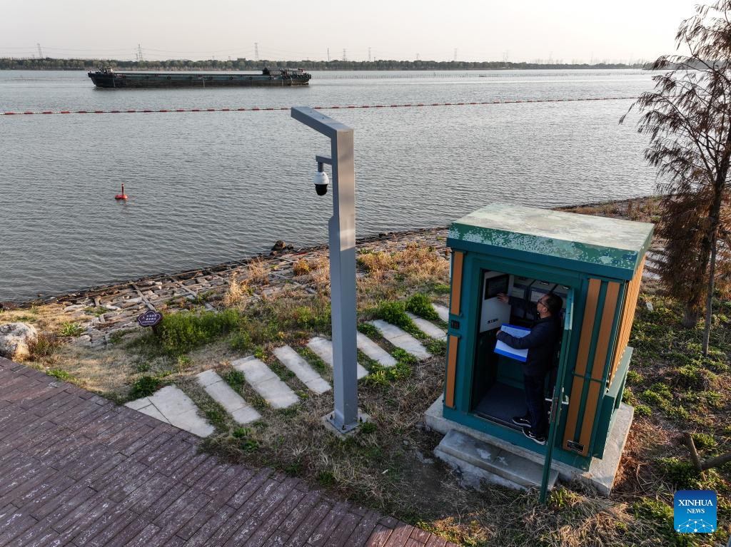 A drone photo taken on March 17, 2025 shows a staff member checking an automatic water quality monitoring station by the Taipu River in Wujiang District of Suzhou City, east China's Jiangsu Province.