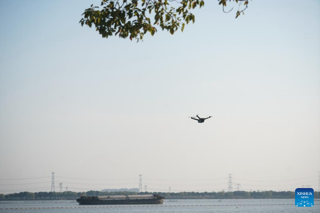 A drone patrols to collect data for an intelligent management platform developed to protect the environment of the Taipu River in Wujiang District of Suzhou City, east China's Jiangsu Province, March 17, 2025.
