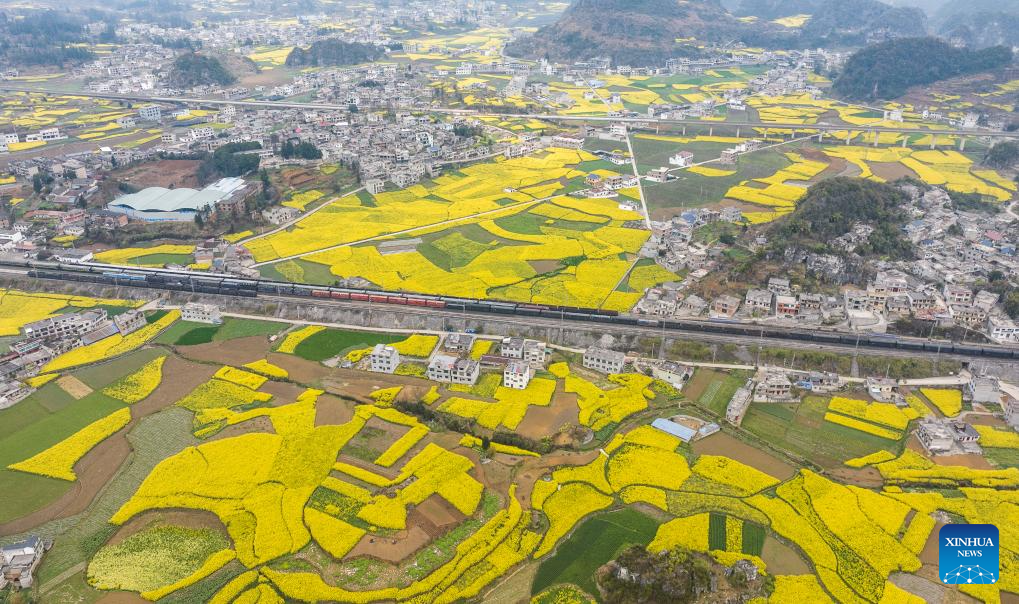 An aerial drone photo shows a high-speed train passing by flowering canola fields in Huachu Town, Puding County, Anshun City, southwest China's Guizhou Province, March 22, 2025. (Xinhua/Tao Liang)