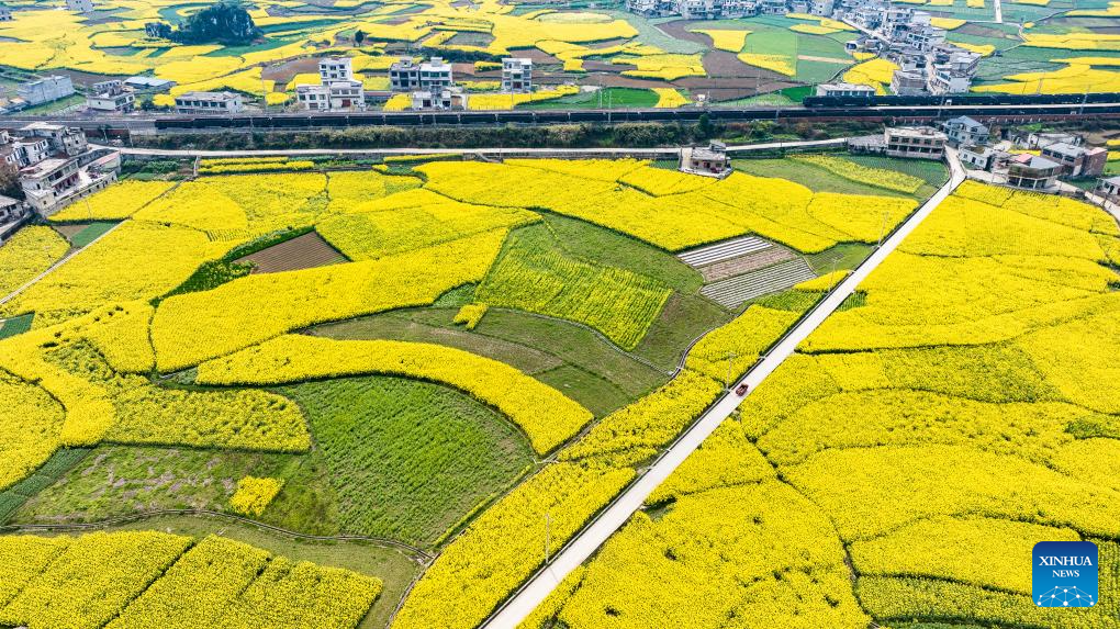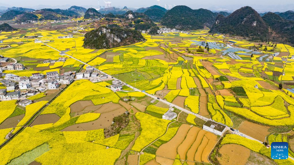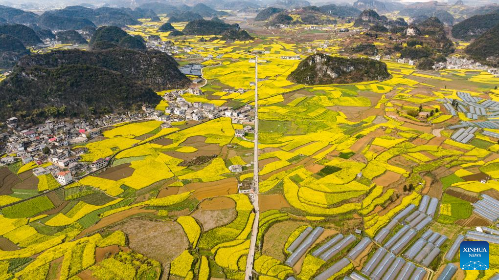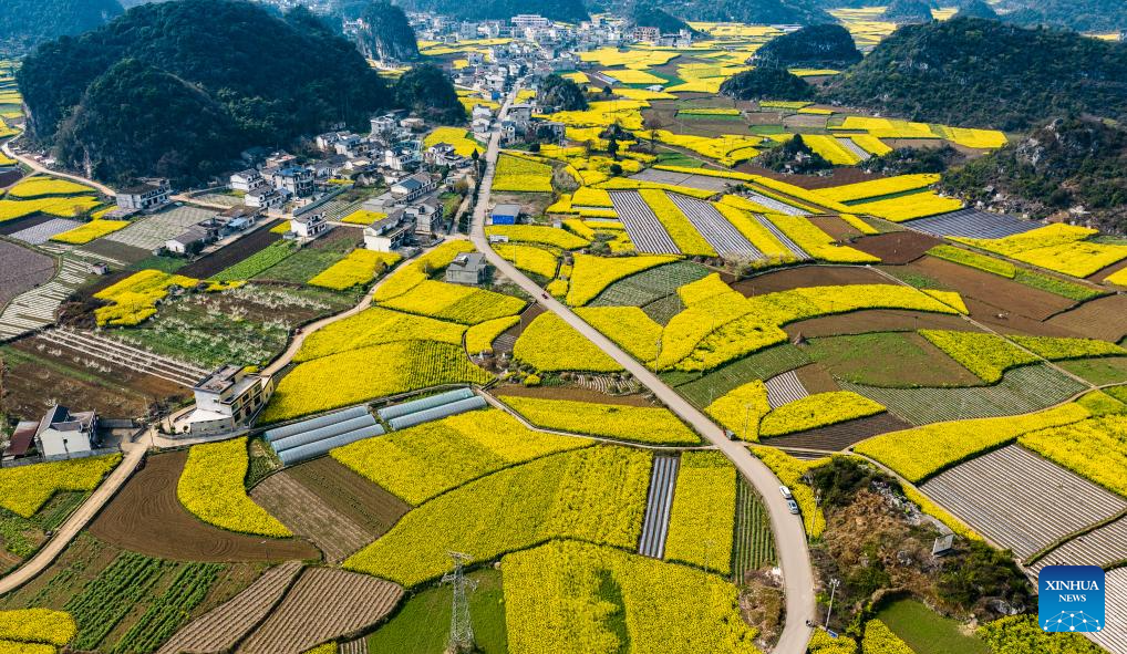 An aerial drone photo taken on March 22, 2025 shows blooming rapeseed flowers in Dibo Village of Mugang Town, Liupanshui City, southwest China's Guizhou Province. More than 1,000 hectares of rapeseed flowers are in full bloom in Mugang. (Xinhua/Tao Liang)