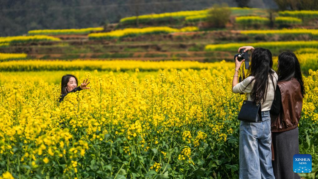 A tourist poses for photos in a rapeseed flower field in Wayao Village of Mugang Town, Liupanshui City, southwest China's Guizhou Province, March 22, 2025. More than 1,000 hectares of rapeseed flowers are in full bloom in Mugang. (Xinhua/Tao Liang)