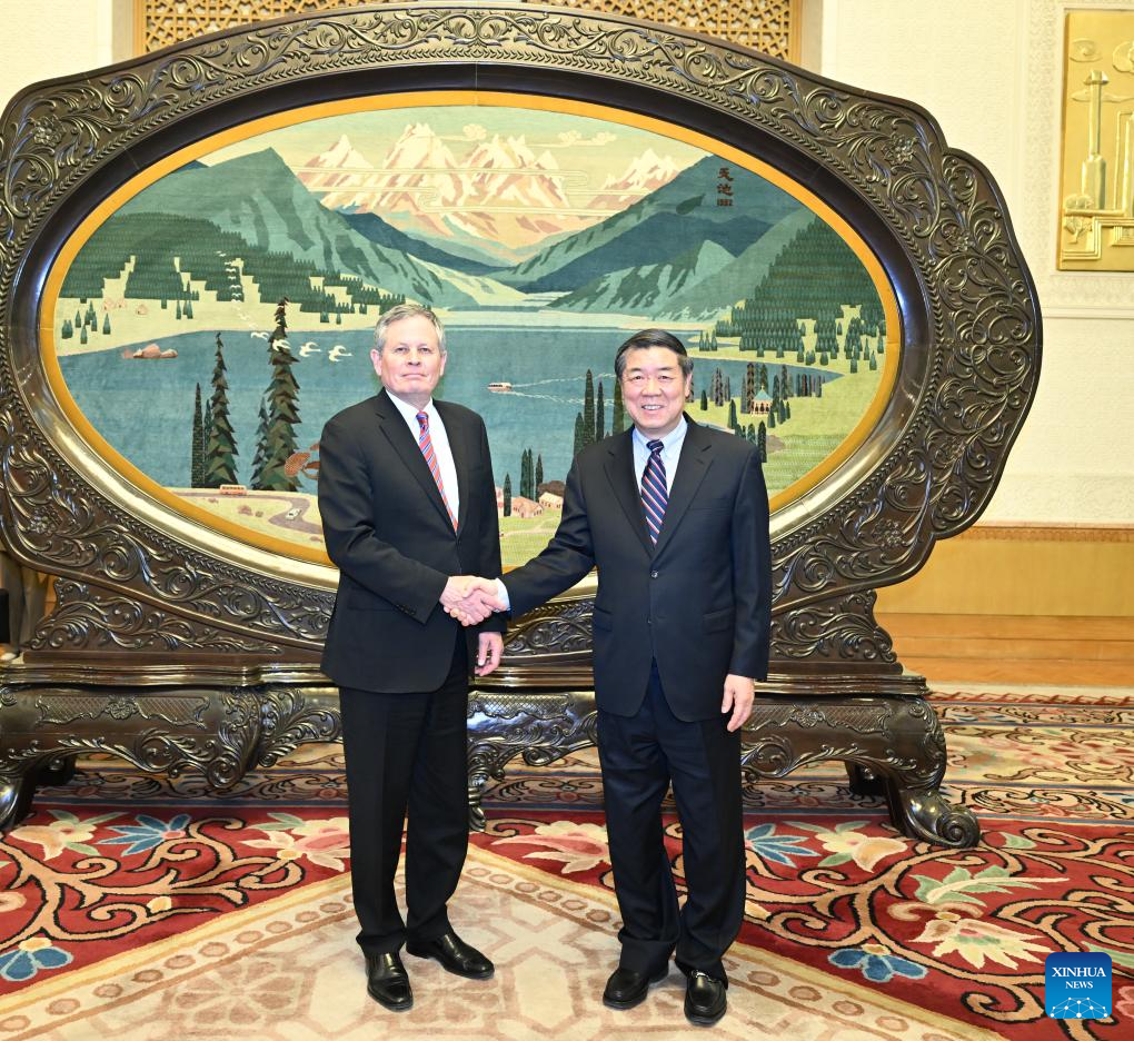 Chinese Vice Premier He Lifeng, also a member of the Political Bureau of the Communist Party of China Central Committee, meets with U.S. Senator Steve Daines in Beijing, capital of China, March 22, 2025. (Xinhua/Li Xiang)