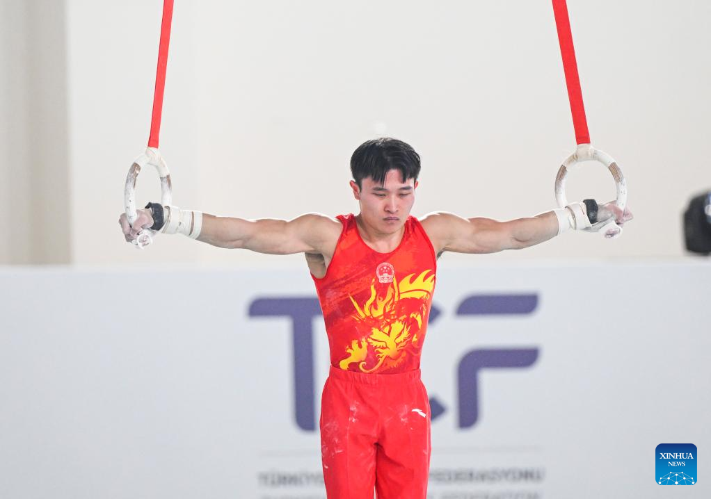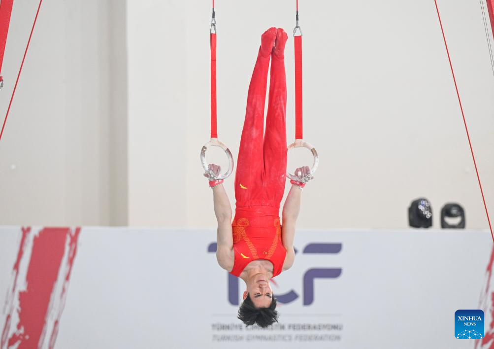 Zhang Boheng of China competes during the men's rings final at the FIG Artistic Gymnastics Apparatus World Cup 2025 in Antalya, Türkiye, March 22, 2025. (Xinhua/Liu Lei)