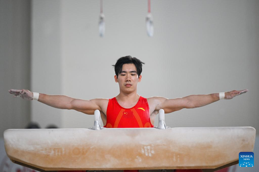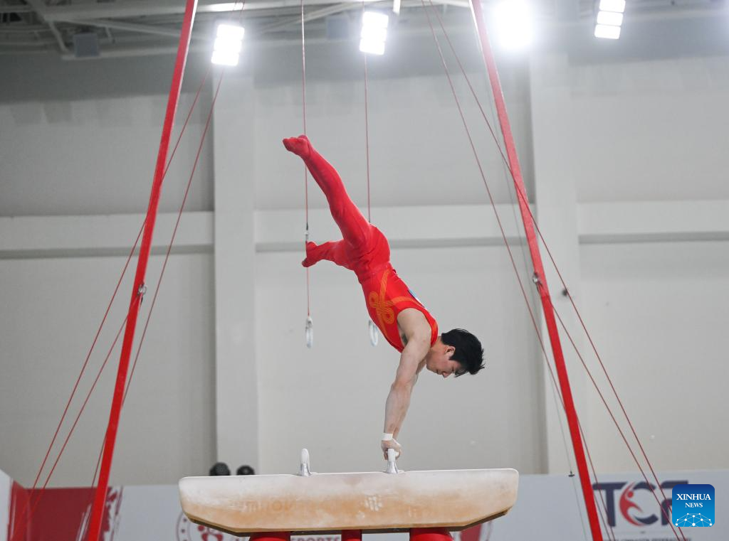 Zhang Boheng of China competes during the men's pommel horse final at the FIG Artistic Gymnastics Apparatus World Cup 2025 in Antalya, Türkiye, March 22, 2025. (Xinhua/Liu Lei)
