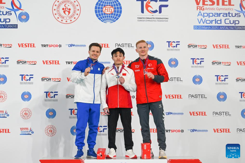 Gold medalist Lan Xingyu (C) of China, silver medalist Nikita Simonov (L) of Azerbaijan and bronze medalist Mehmet Ayberk Kosak of Türkiye pose during the awarding ceremony for the men's rings final at the FIG Artistic Gymnastics Apparatus World Cup 2025 in Antalya, Tükiye, March 22, 2025. (Xinhua/Liu Lei)